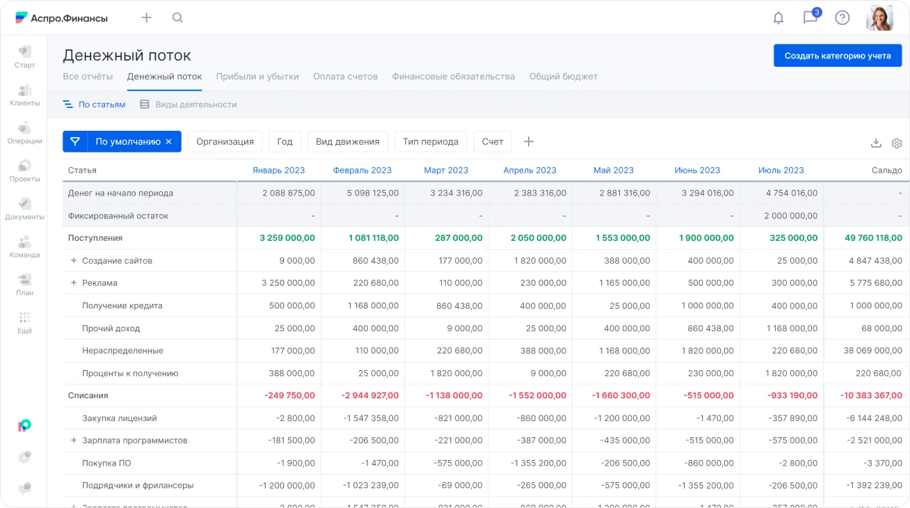 Отчет ДДС показывает денежные потоки по разным направлениям работы, чтобы вы находили самые рентабельные проекты и следили за обязательствами компании.